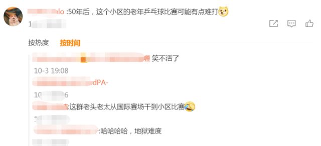 还有网友称此开起了玩笑,50年后,这个小区的老年乒乓球比赛可能有点难的。还有网友表示这帮老头老太,从国际赛场打到了小区比赛。奥运冠亚军们都住在了一个小区,相信很多人之后就能看到盛大的景象,就是他们成群结队的在楼下打乒乓球并且还能玩出花样。