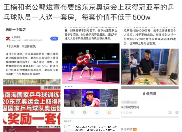 不管是谁获得奖励,都是通过自己的努力得来的,他们如果没有得到冠亚军,我想王楠也不会送给他们一套房子。他们对国乒的奉献,远远不止一套房子怎么简单。
