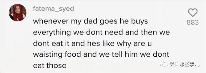 “每次我爸去超市,都会买一堆我们不要的东西,我们不吃,他还问我们为啥要浪费食物。我们还得给他解释,我们不吃那些。”