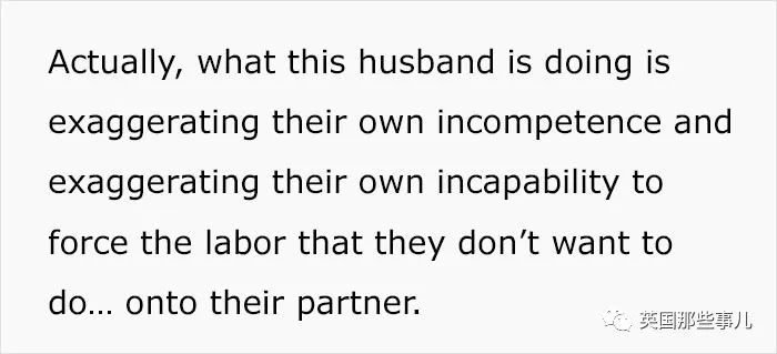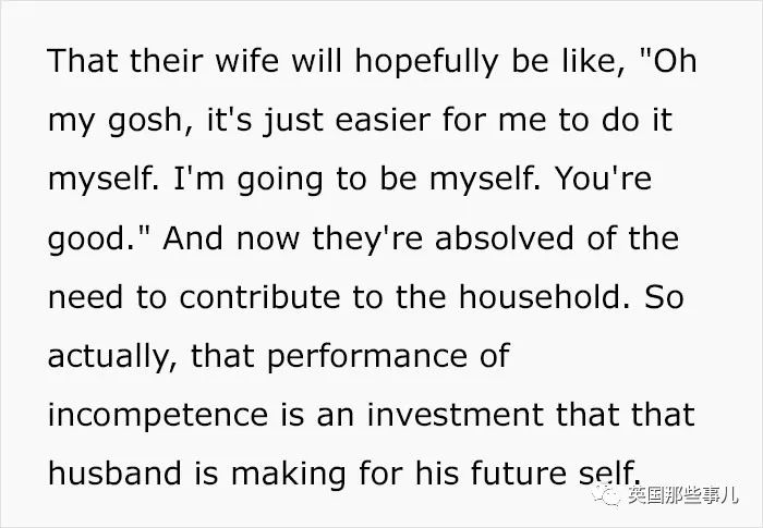 他们夸大自己的无能,夸张地表演自己干不来那些强加给他们的,他们不爱做的家务。”