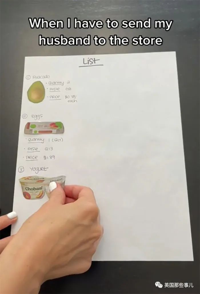 而是打印好了自己要买的每一样东西的照片,再把照片剪好,贴在一张纸上。