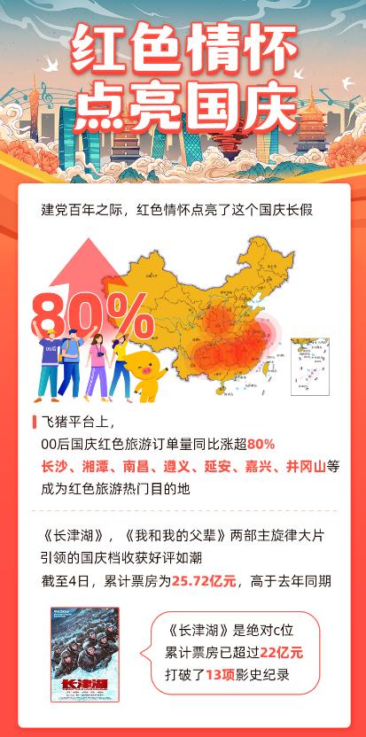 红色旅游成为今年国庆旅游市场的新亮点。飞猪平台上,00后国庆红色旅游订单量同比涨超80%。长沙、湘潭、南昌、遵义、延安、嘉兴、井冈山等是红色旅游热门目的地。