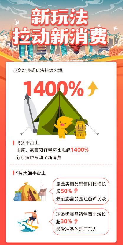 新玩法拉动新消费。天猫平台9月数据显示,自驾游带动车载电饭煲销量环比增长近20%。露营类、冲浪类、垂钓类商品销售分别同比增长超50%、30%和20%。天猫国际平台上,进口骑行装备销售同比增长超170%,进口露营用品同比增长近130%。最爱露营的是江浙沪人,最爱冲浪的是广东人,湖南人湖北人爱垂钓。