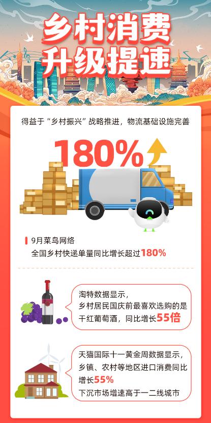 得益于国家“乡村振兴”战略持续推进,乡村物流基础设施不断完善,农民增收,网购需求被激活。菜鸟网络目前已落地1000多个县域,9月其全国乡村快递单量同比增长超过180%。