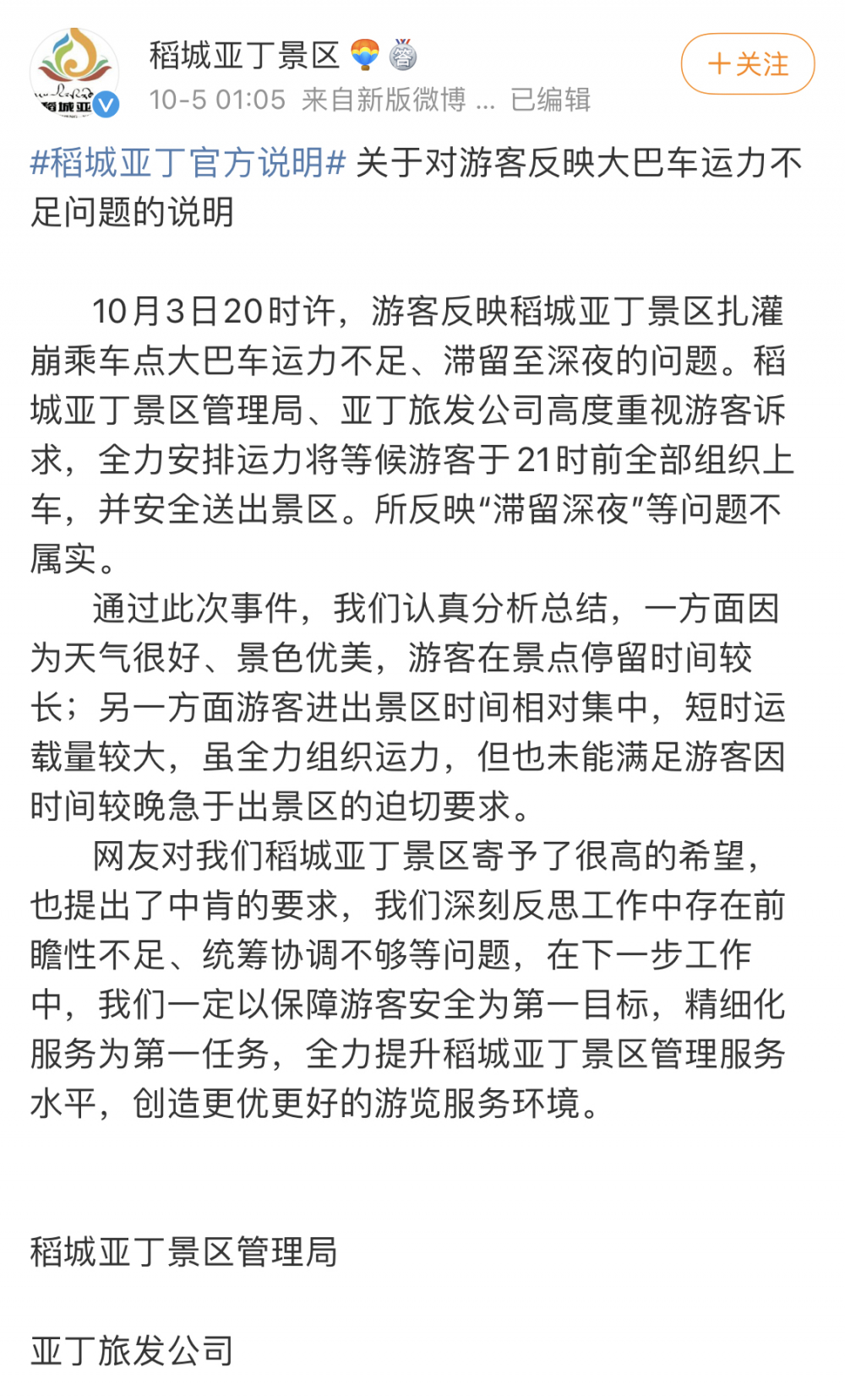 鉴于网友对稻城亚丁景区寄予了很高的希望,也提出了中肯的要求,景区将深刻反思工作中存在前瞻性不足、统筹协调不够等问题,在下一步工作中,一定以保障游客安全为第一目标,精细化服务为第一任务,全力提升稻城亚丁景区管理服务水平,创造更优更好的游览服务环境。