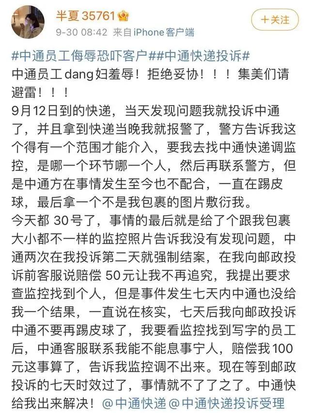 9月30日,一位网友发微博称,9月中旬她网购了一个筋膜枪,两天后收到快递时,发现包裹上写有许多不堪入目的侮辱字眼,多次向快递公司及12305投诉此事,均未得到回复。