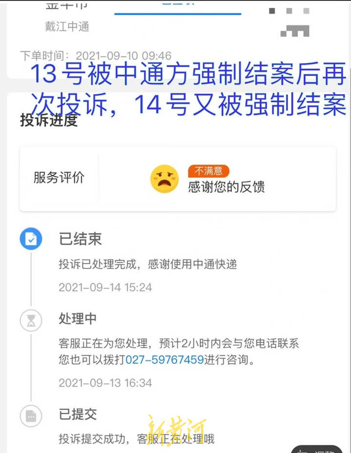 张华在9月12日、9月13日,先后两次向中通快递公司客服投诉此事,但她发现自己的两次投诉在均未得到回应时,却都显示已经处理完成。随后她又通过12305申诉小程序反映,但依然未收到中通快递的正面回复。9月29日下午,张华再次联系了中通快递客服,客服回应“仍在调查核实”。