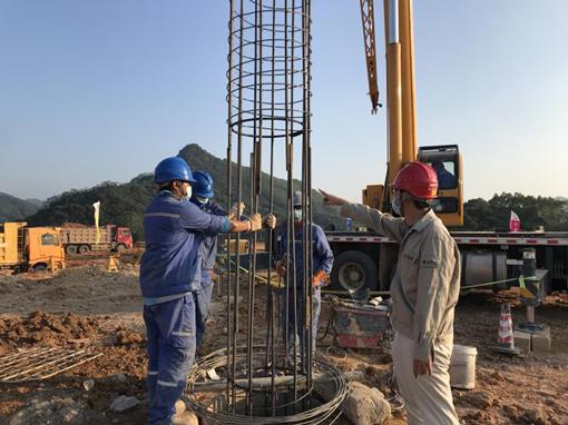 闽粤联网工程施工管理人员正在对钢筋笼进行质量检查。