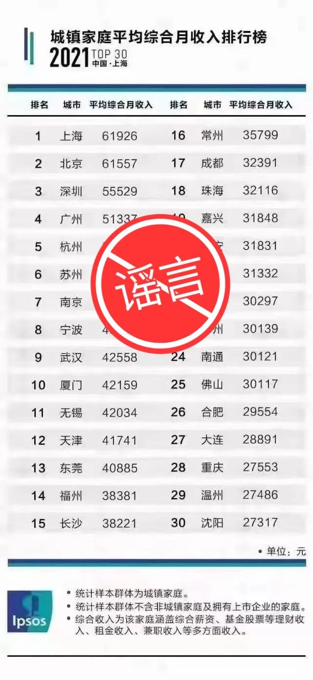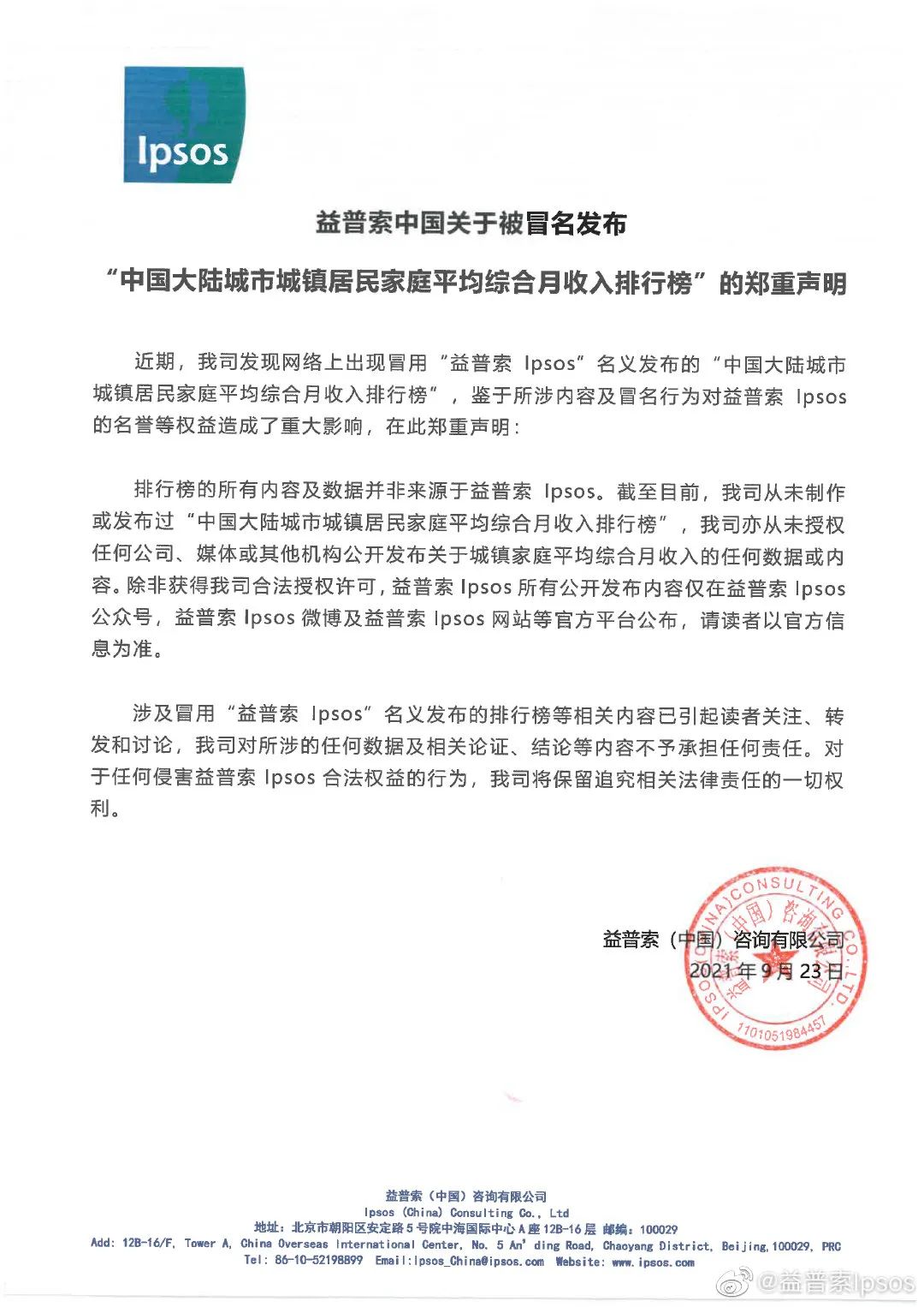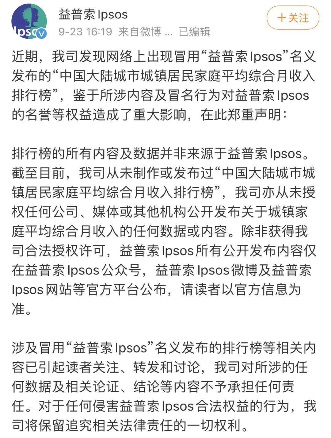 益普索(中国)咨询有限公司声明称,发现网络上出现冒用“益普索Ipsos”名义发布的“中国大陆城市城镇居民家庭平均综合月收入排行榜”,其所有内容及数据并非来源于益普索Ipsos,该公司从未制作或发布过“中国大陆城市城镇居民家庭平均综合月收入排行榜”。
