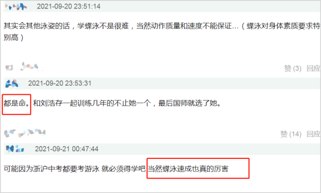 另外,评论区中有“体育生”爆料,称“作为一个游泳专项的体育生,6天学会蝶泳,而且只会蝶泳是不可能的事……”