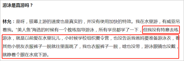 不过,林允之前在接受“北京青年周刊”采访中确实谈过自己“没有特意去练游泳”,自己只不过“小时候睁着个眼就在水底下游”!