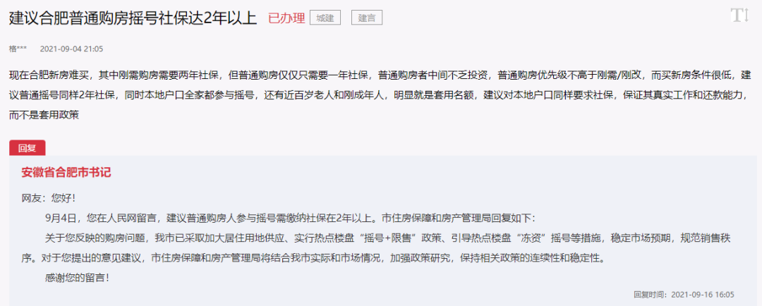 对此,9月16日,合肥市住房保障和房产管理局回复称,关于网友反映的购房问题,我市已采取加大居住用地供应、实行热点楼盘“摇号+限售”政策、引导热点楼盘“冻资”摇号等措施,稳定市场预期,规范销售秩序。对于您提出的意见建议,市住房保障和房产管理局将结合我市实际和市场情况,加强政策研究,保持相关政策的连续性和稳定性。