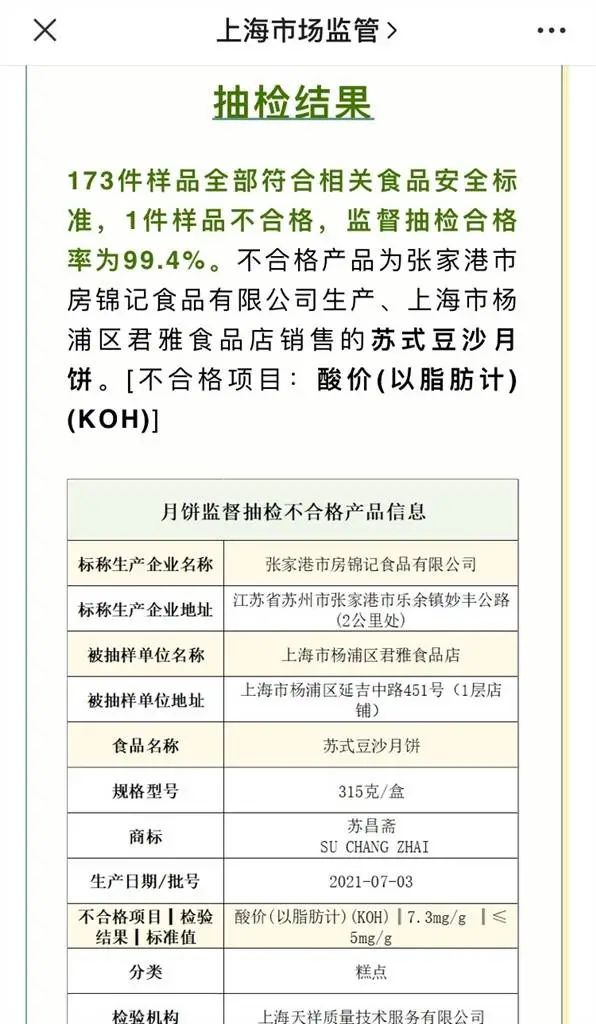 每年中秋节前夕,各地市场监管局都会开展月饼专项抽查。9月17日,上海市市场监管局公布了抽检结果,抽检的173件月饼样品合格,1件张家港市房锦记食品有限公司生产、上海市杨浦区君雅饰品店销售的苏式豆沙月饼酸价(以脂肪计)(KOH)不合格。
