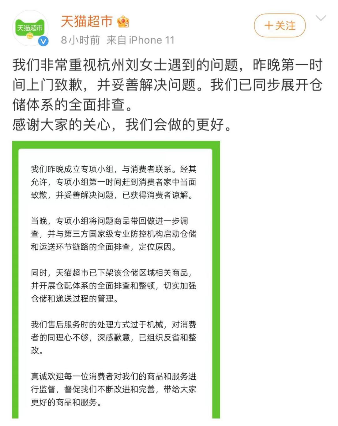 9月16日,天猫超市官方微博发布消息称:非常重视杭州刘女士遇到的问题,昨晚第一时间上门致歉,并妥善解决问题,已获得消费者谅解。