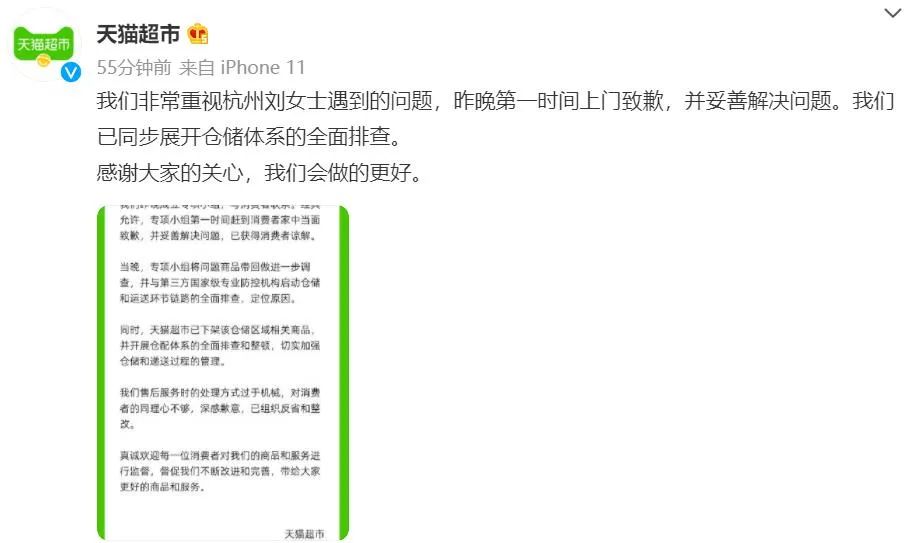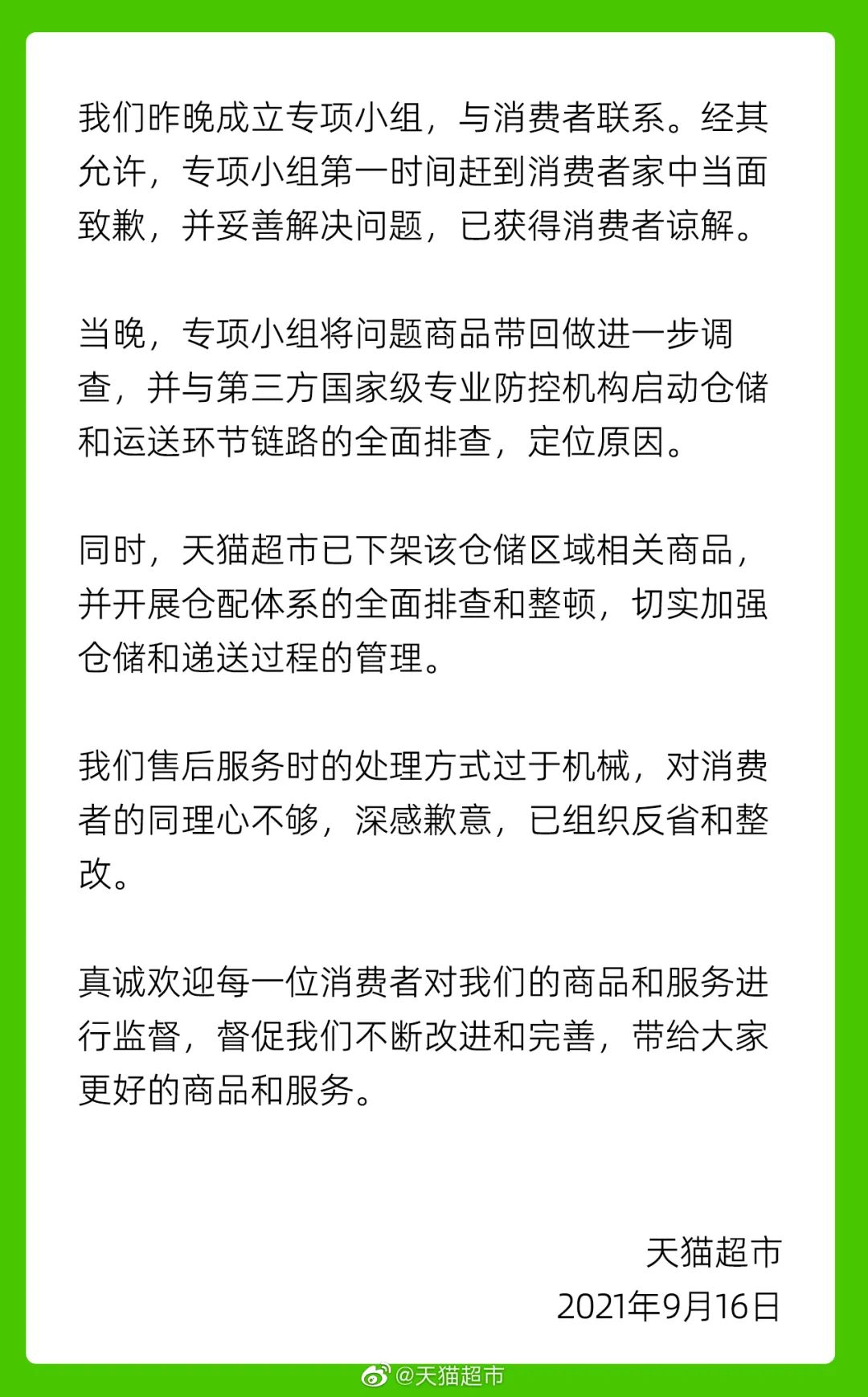 9月16日,天猫超市最新回应称: