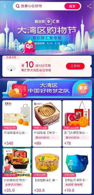 为更多地回馈消费者,释放大湾区消费动力,营造更加喜庆的嘉年华氛围,承办单位阿里巴巴发出了一系列优惠活动。早在9月2日启动当天,共有300多万消费者在手机淘宝上点亮“数字明月”,共同开启粤港澳大湾区购物节。在聚划算直播间,有超过100万消费者关注了集中亮相的92件大湾区梦之队好物,并快速在淘宝天猫上领走了超过1000万的红包补贴。截至9月13日,在淘宝天猫平台上,大湾区购物节已经发放红包超过200万个。