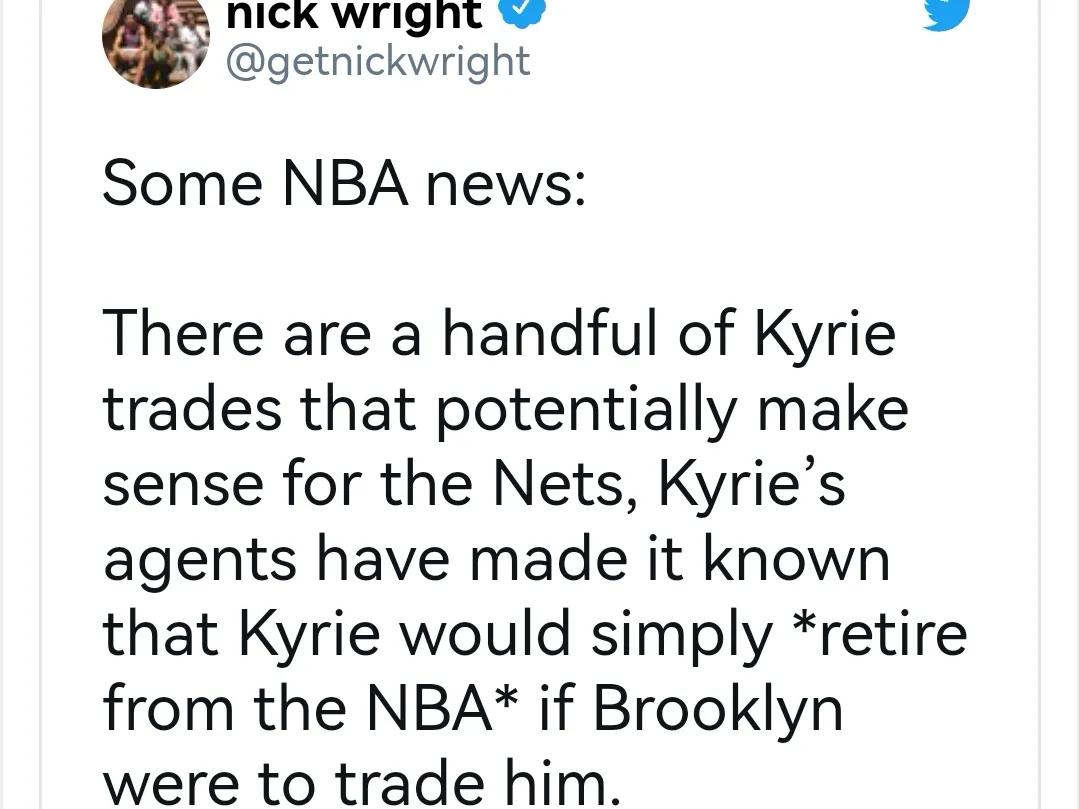 “凯里有几笔交易可能对篮网队有意义,凯里的经纪人已经告诉我们,如果布鲁克林交易他,凯里就会从NBA退役。”