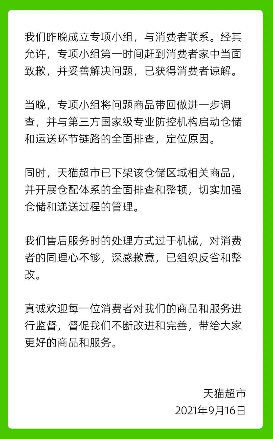 9月16日,天猫超市回应称,平台在消费者投诉当晚第一时间成立专项小组,赶赴消费者家中当面致歉,并已妥善解决问题,得到了该消费者的谅解。